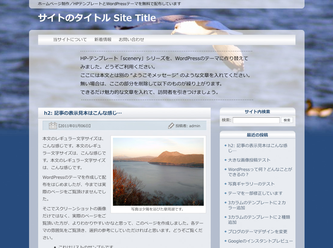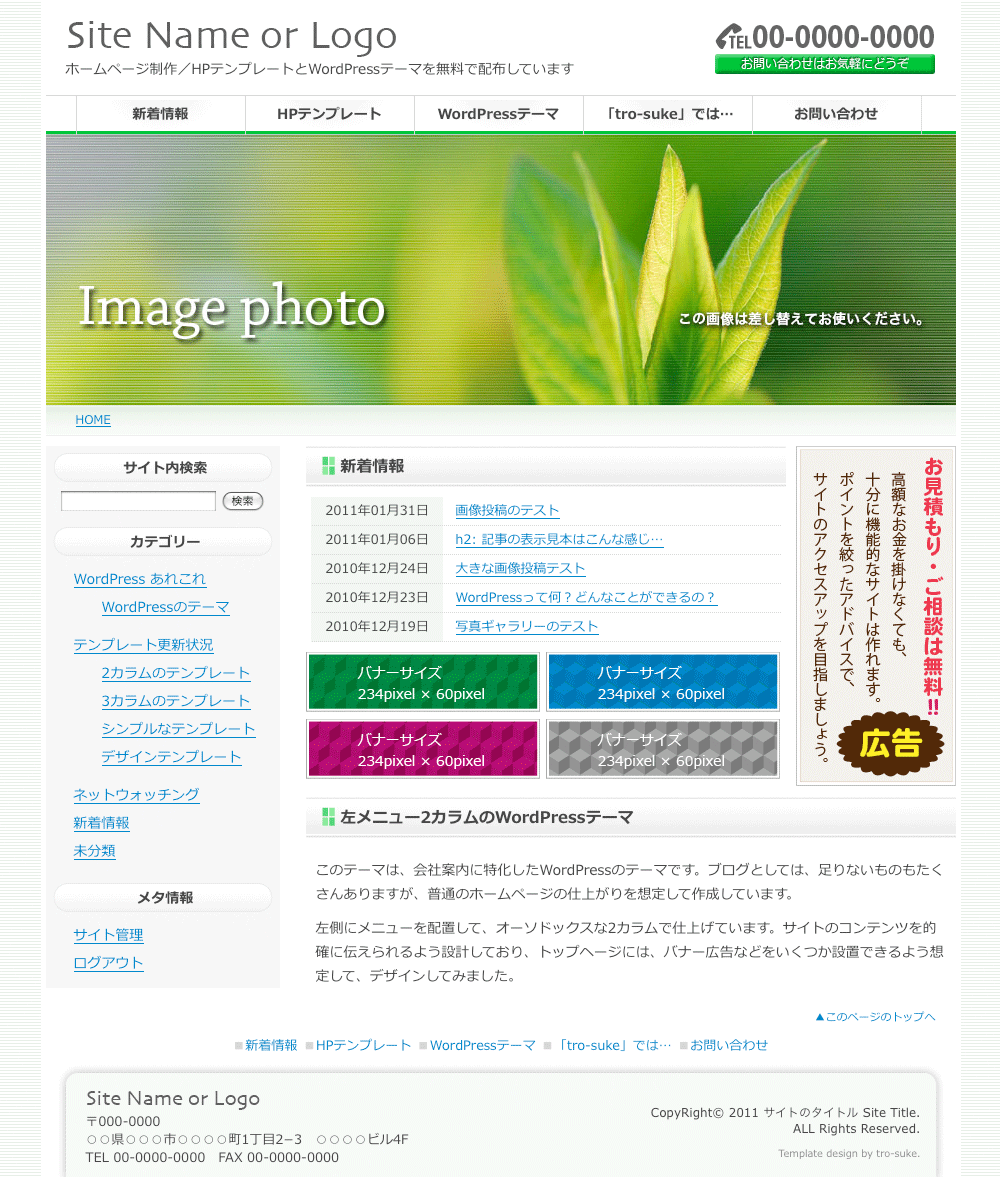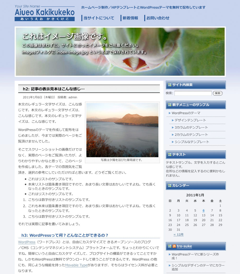 このテーマは、「tro-suke」で配布しているホームページテンプレートの中で、とりわけ人気の高い「sp-deシリーズ」をWordPressのテーマにしてみました。ホームページテンプレートよりもメニューの細部などを改良しており、自信の仕上がりとなっております。