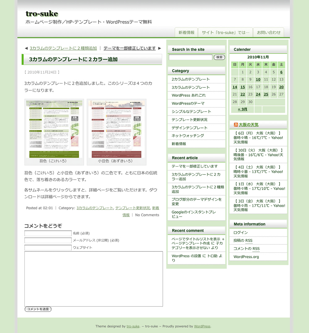 ホームページテンプレート「秘色(ひそく)」と「亜麻色」、それから「淡藤色」、「淡黄」をWordPressのテーマに作り替えてみました。ホームページテンプレートでは、左メニューだけでしたが、WordPressのテーマでは、右メニューも作成しております。